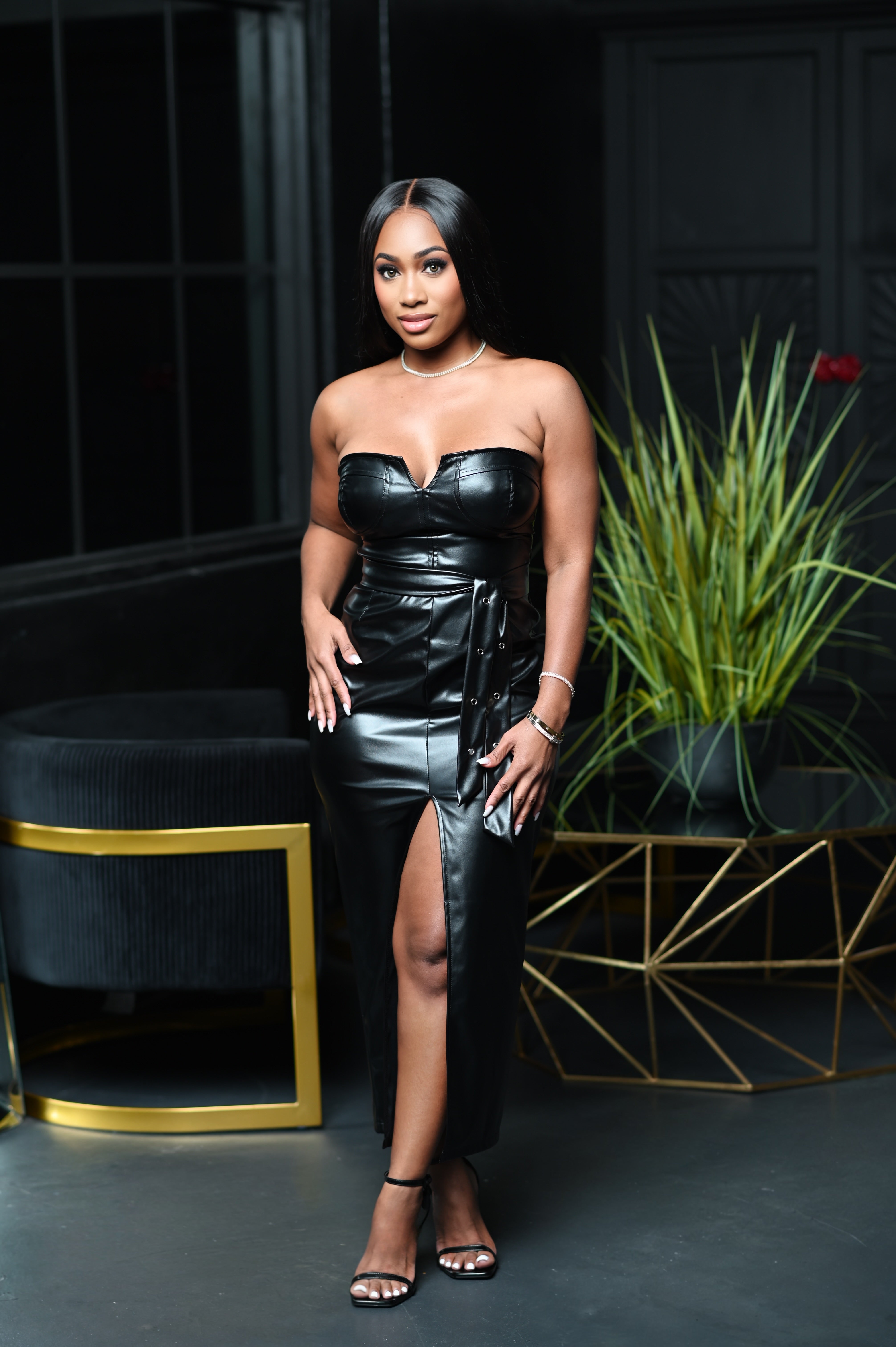 Introducing the stunning Aurora Strapless Pu Leather Dress in elegant black! This dress features a flattering middle split and medium stretch fabric, offering both comfort and style. And to cinch your waist and accentuate your curves, a chic waist belt is included. Elevate your wardrobe with this must-have statement piece!